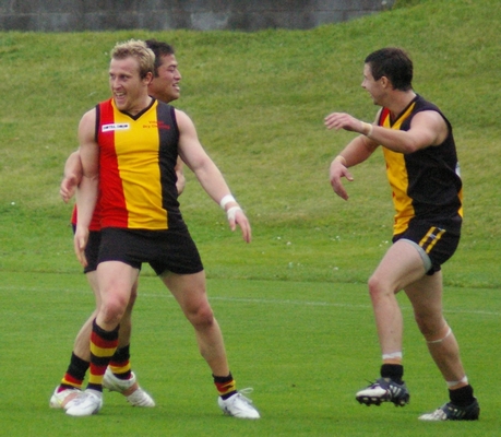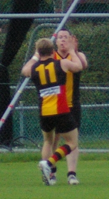 Reeves celebrates one of his 5 goals and Stride takes a grab
