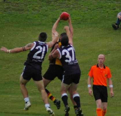 Marson makes the goal umpire look silly as he and Hanson work hard to stop