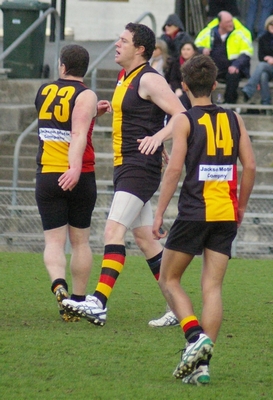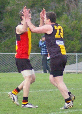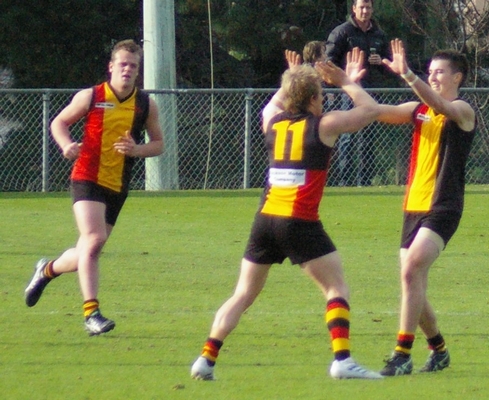 Gowans celebrates his goal and marks to Saunders and and Gowans again